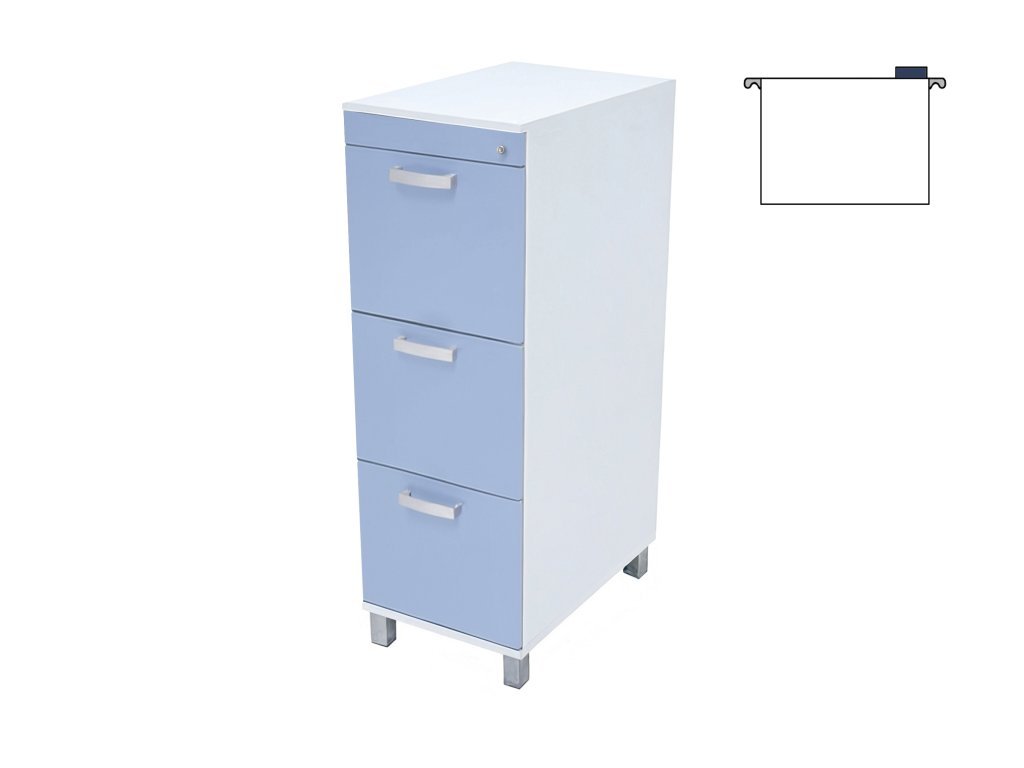 Kartotéka na závěsné složky karet A4 se třemi plnovýsuvnými zásuvkami.