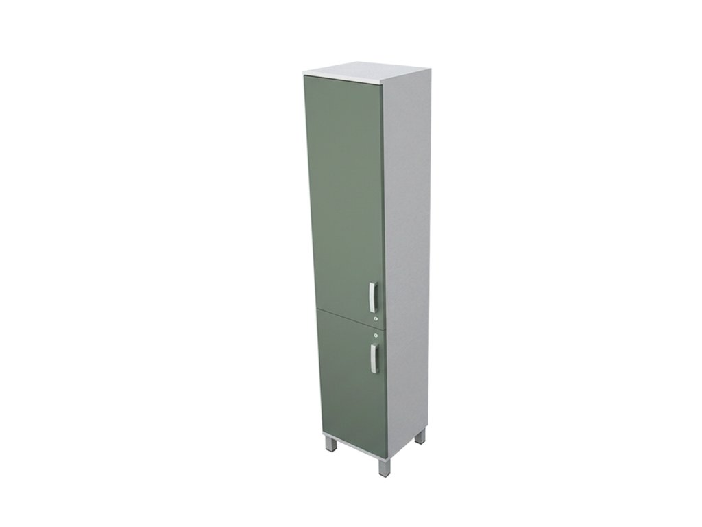 Skříň do ordinace vysoká, úzká, dveře dělené, police