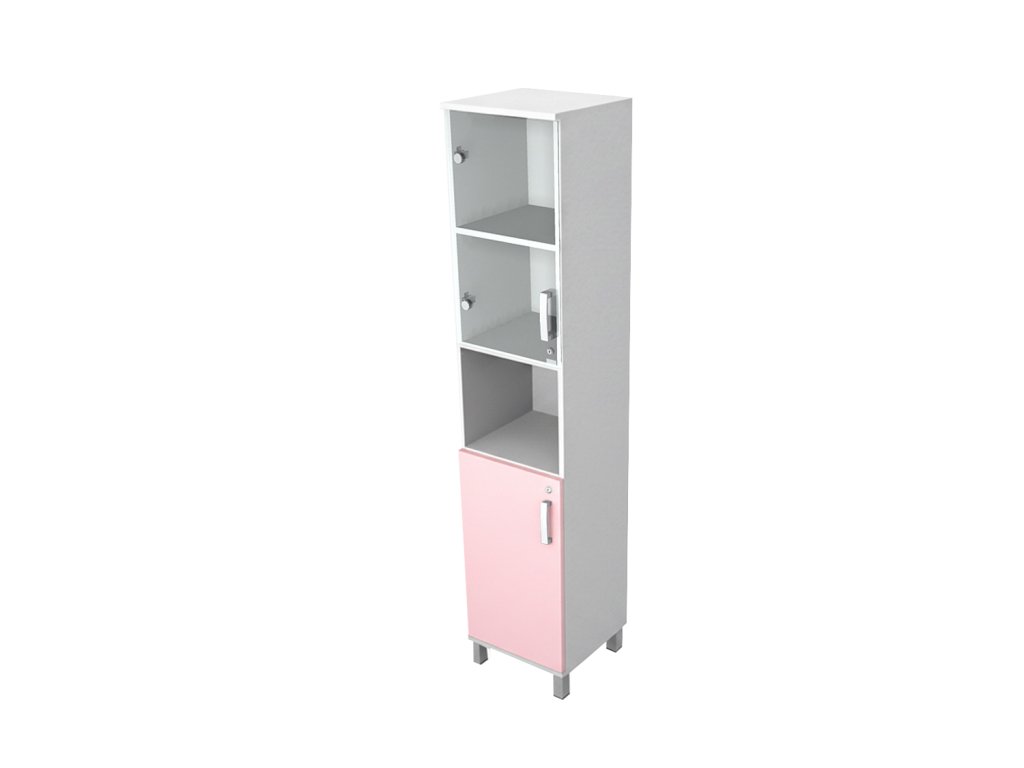 Skříň do ordinace vysoká, úzká, dveře dělené / sklo, police